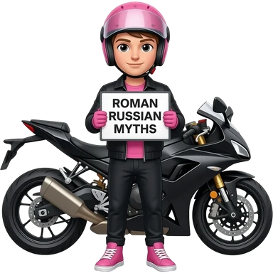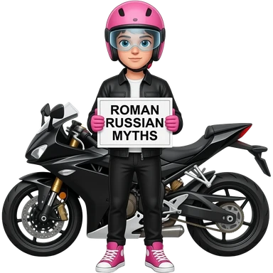 a young man with black jacket and pants wearing pink sneaker and pink gloves, he also wears a pink helmet with an unvisible vision, he stands in front of a black white motorcycle and is holding a ROMAN RUSSIAN MYTHS sign emoji