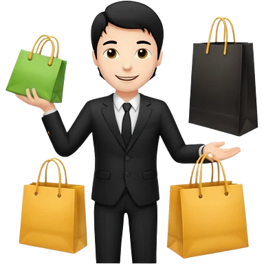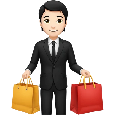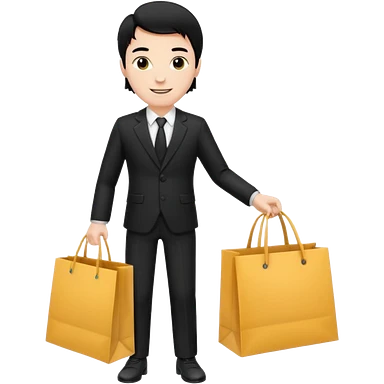 a white elegant man black hair in a black suit with clothing shopping bag emoji