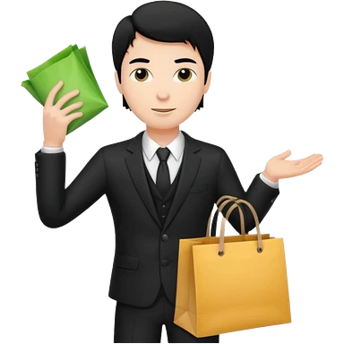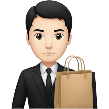 elegant serious man black hair in a black suit with clothing shopping bag emoji