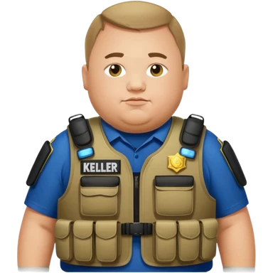 A fat police man with Down syndrome, with a armor vest that has a name tape that says Keller emoji