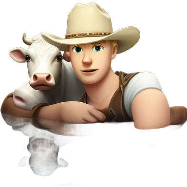 White boy withba cowboy had laying his head on top of a cow in a beautiful pond with sunset emoji