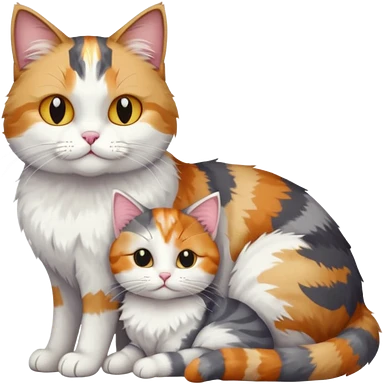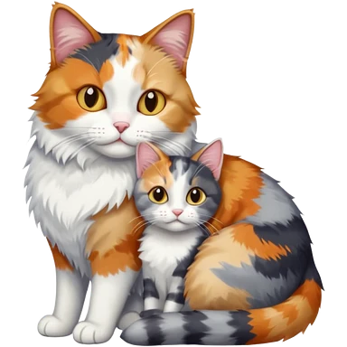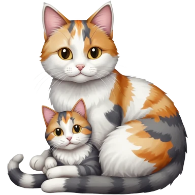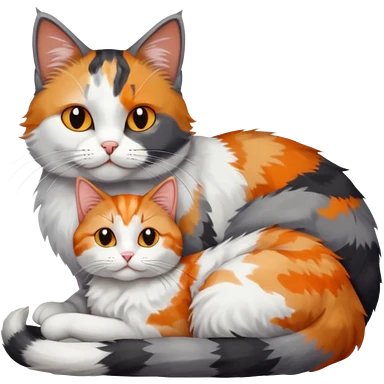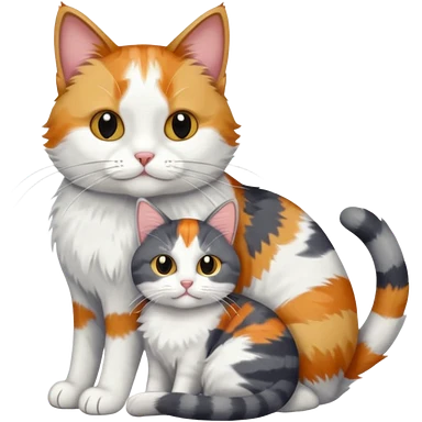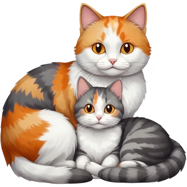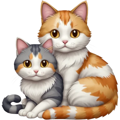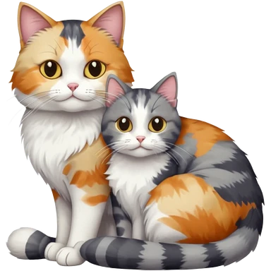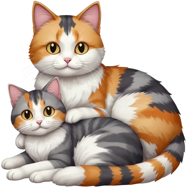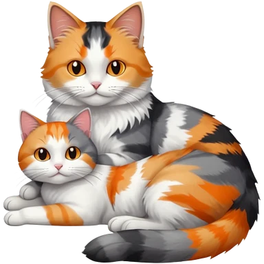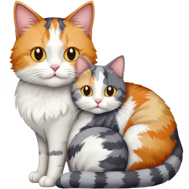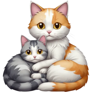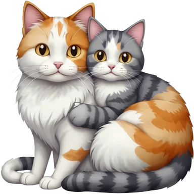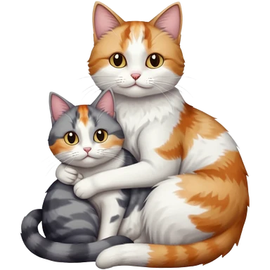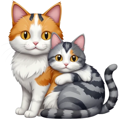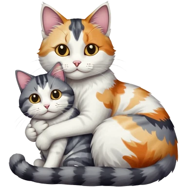 full body colourful light patched calico + white tabby cat cuddling a grey and white cat emoji