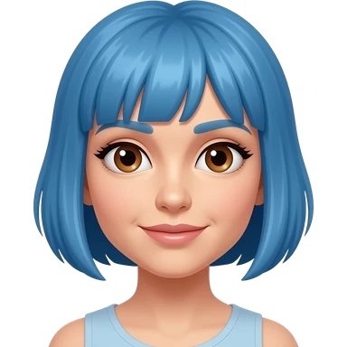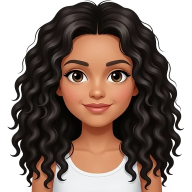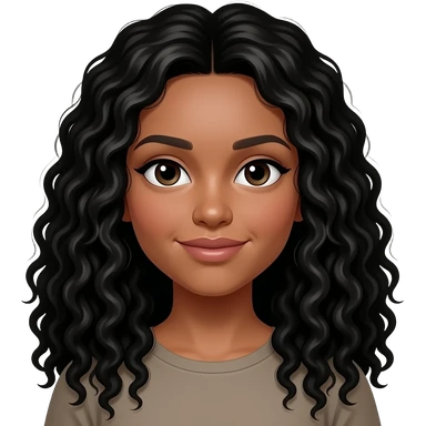 A white woman with Long straight hair with bangs, black hair, brown eyes and a black low-cut shirt smiling emoji