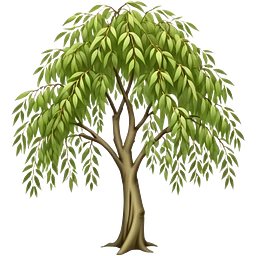 A 3D cartoon willow tree with drooping green branches over soft grass, natural sunlight, Memoji-style rendering. emoji