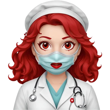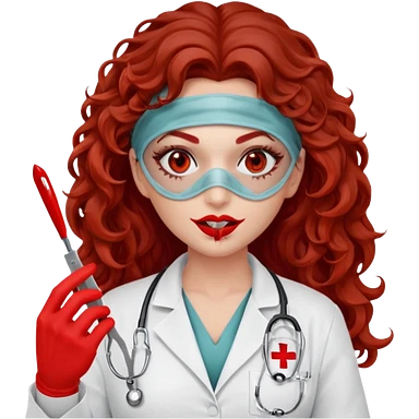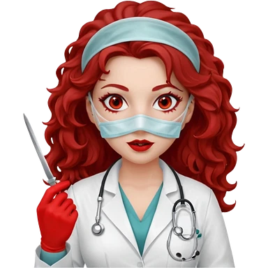 Scary woman scalpel in hand, evil surgeon sexy surgeon clothes. She has red eyes. Her brown long curly hair. Wears sexy doctor outfit with red gloves. make her hair free and brown but have mouthy wear mask to hide. Wears white surgeon jacket and face under a veil emoji