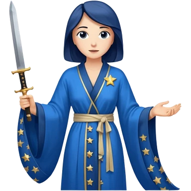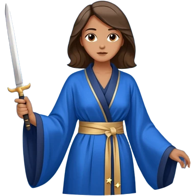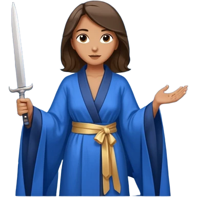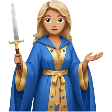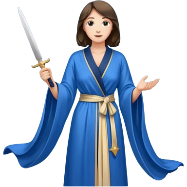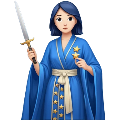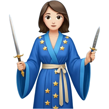 An upright Europe (a tall woman), wearing a blue, flowing robe with stars on the hem. In the background stands a man, with a knife emoji