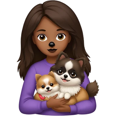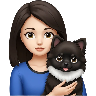 A woman who has brunette long hair is holding a black and white 1 Pomeranian dog who has black face but in the middle he has a white line from the nose emoji | AI Emoji Generator