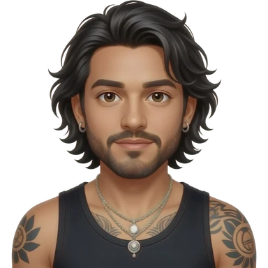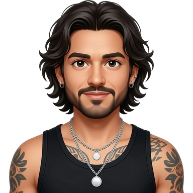 handsome, manly Latino podcast host with black colored eyes wearing a black tank top with silver jewelry, with medium length hair, a very long, lightly graying beard and tattoos, his ear and nose pierced, his hair is a mess because he just woke up emoji