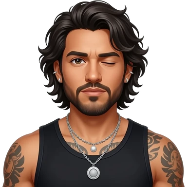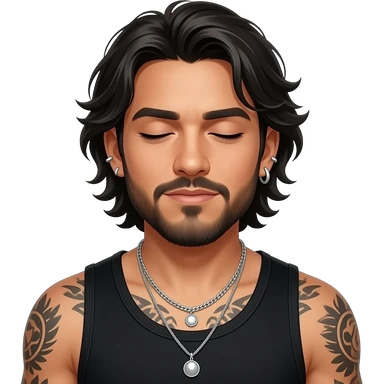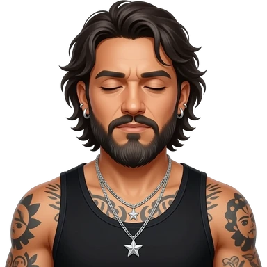 handsome, manly Latino podcast host with black colored eyes wearing a black tank top with silver jewelry, with medium length hair, a very long, lightly graying beard and tattoos, his ear and nose pierced, his hair is a disheveled because he just woke up, eyes barely open emoji