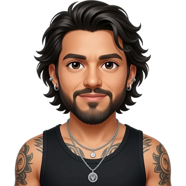 handsome, manly Latino podcast host with black colored eyes wearing a black tank top with silver jewelry, with medium length hair, a very long, lightly graying beard and tattoos, his ear and nose pierced, his hair is a big mess because he just woke up, eyes barely open emoji