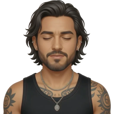 handsome, manly Latino podcast host with black colored eyes wearing a black tank top with silver jewelry, with medium length hair, a very long, lightly graying beard and tattoos, his ear and nose pierced, his hair is a disheveled because he just woke up, eyes barely open emoji