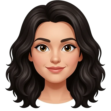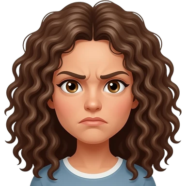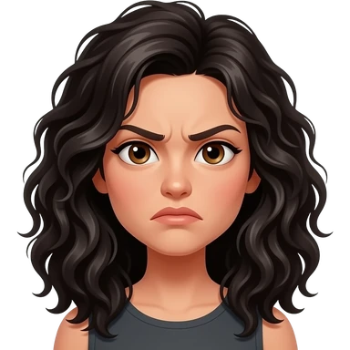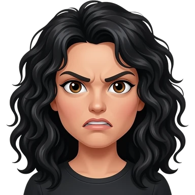 The head of a woman with dark brown eyes, long really curly messy black hair, with a mad expression emoji
