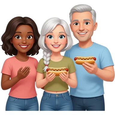 Brown skinned woman with dark hair and a white woman with white gray hair and white man with shaved head celebrating with hot dogs emoji