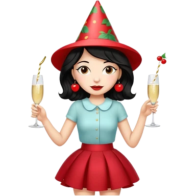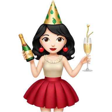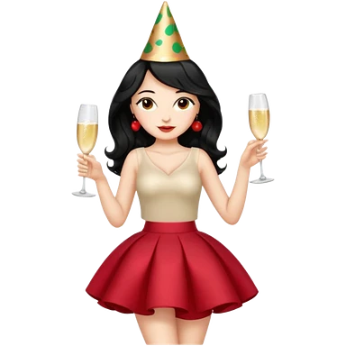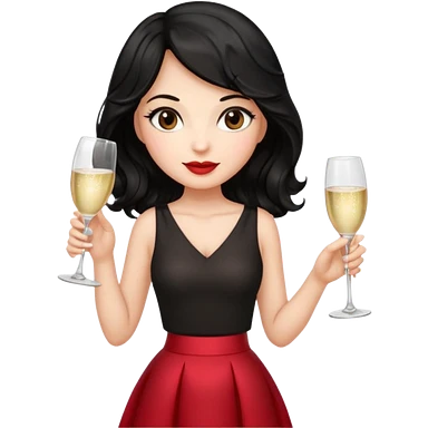 A woman with wavy black hair in a cherry skirt, beautiful and authoritative, drinking champagne emoji