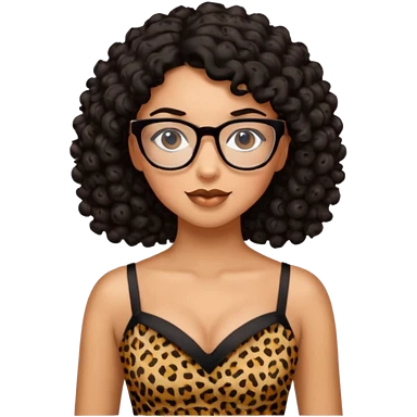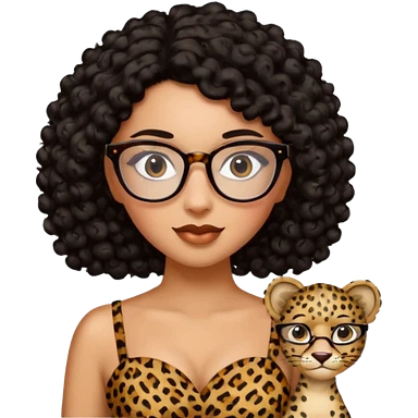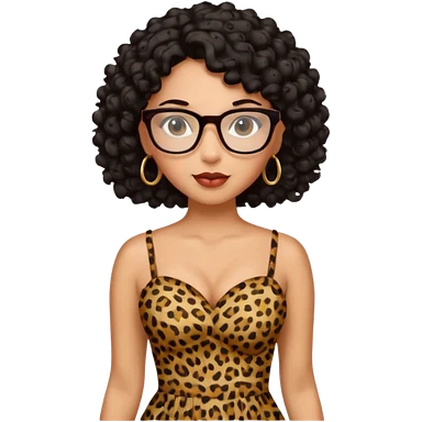A women who wears glasses with a black curly hair, in a leopard print dress sweetheart neckline emoji