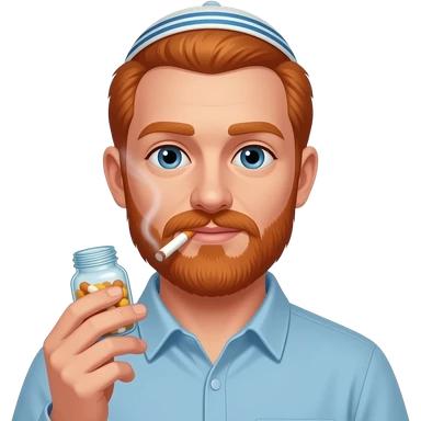 A redheaded guy wearing a yarmulke smoking a cigarette and holding a bottle of pills emoji