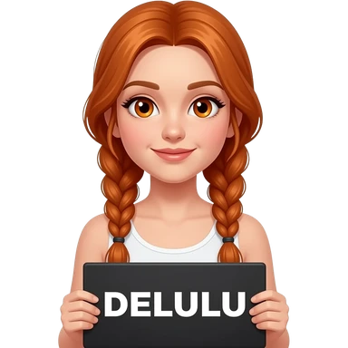 sexy girl with long ginger braids and ginger eyes wearing a white tanktop is holding a black sign with DELULU written on it emoji