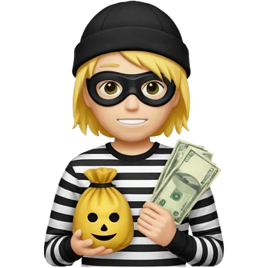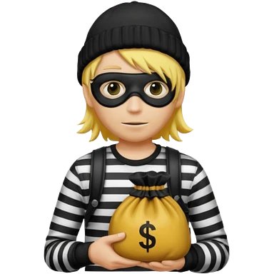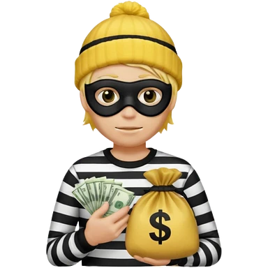 A yellow guy with a black beanie white black striped shirt a black mask for it's eyes and holding a money bag with yellow hair emoji | AI Emoji Generator
