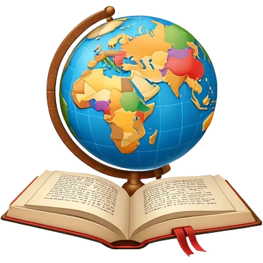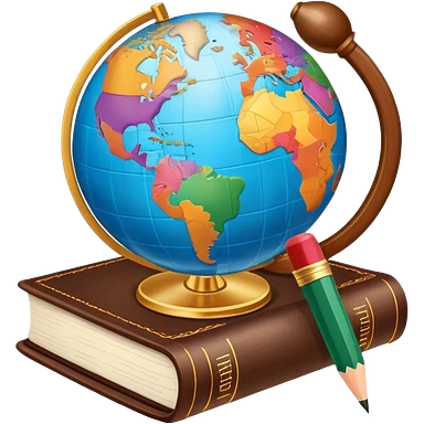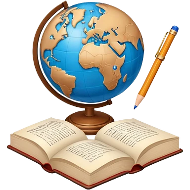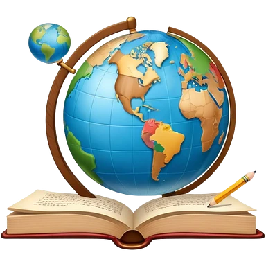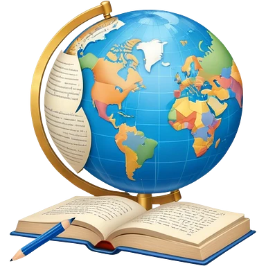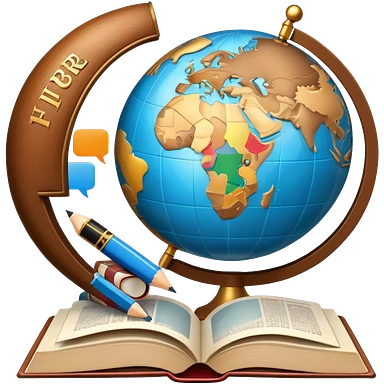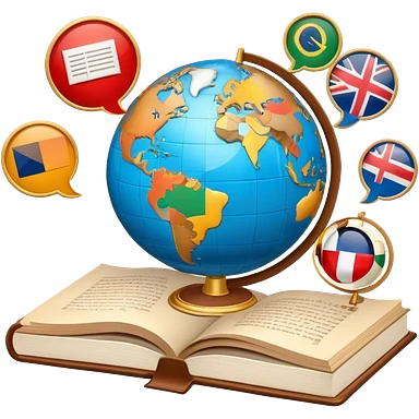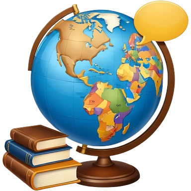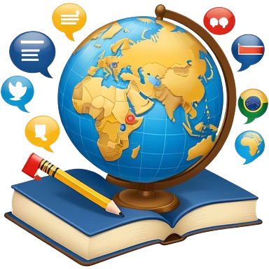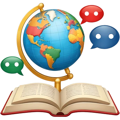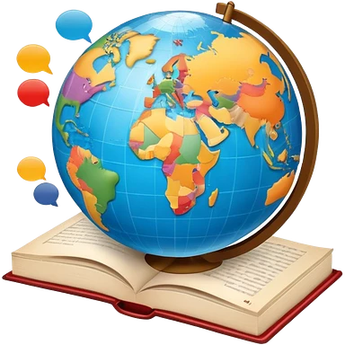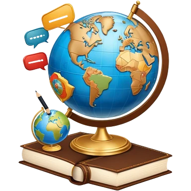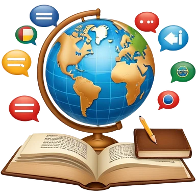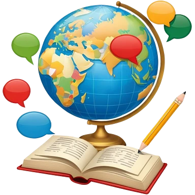 An icon featuring a globe with speech bubbles in different languages, symbolizing the study of foreign languages. The design includes a book and a pencil, representing learning and communication across cultures. Transparent background highlights the global nature of language education. emoji