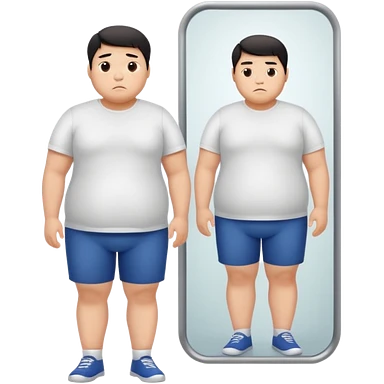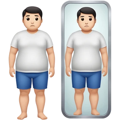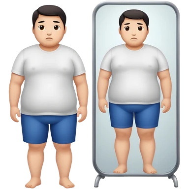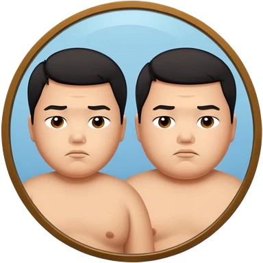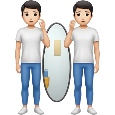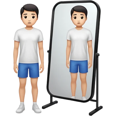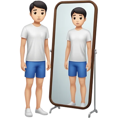 A young Asian guy is sadly examining his body in a full-length mirror. emoji | AI Emoji Generator