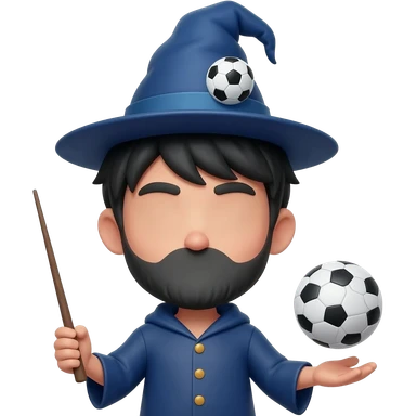 a young, beardless, black-haired wizard with a blue hat with a balloon drawn in front of the eyes holding a wand in one hand and a floating soccer ball in the other. He has a big smile and two white glowers. the cloak is tied with a yellow rope emoji | AI Emoji Generator
