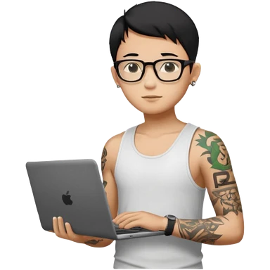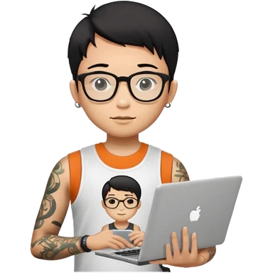 A young boy DEVELOPER WITH A laptop, black straight short hair, wearing glasses, he is asian