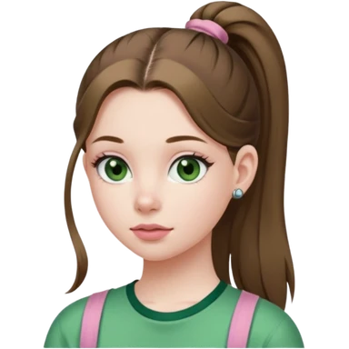 create an emoji of a young woman. She has a nice look, with long brown hair in a single ponytail with a hair tie, dark green eyes, pale skin, natural soft pink lips. she wears a green y2k top emoji