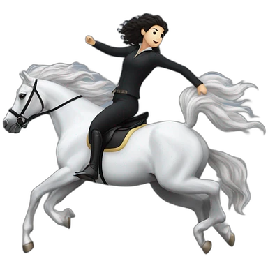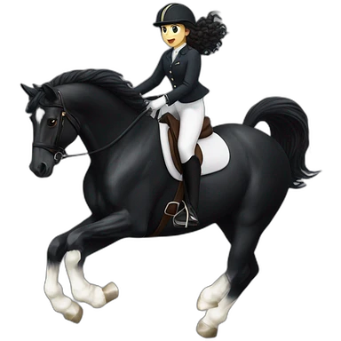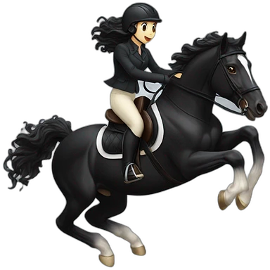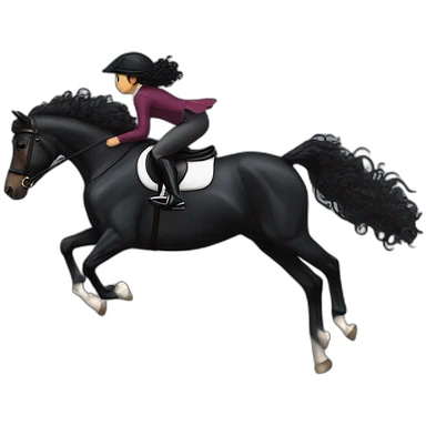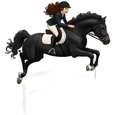 a JET BLACK HORSE JUMPING AN OBTACLE, tHE HORSES RIDER IS A YOUNG FEMALE WITH LONG CURLY BRUNNET HAIR emoji