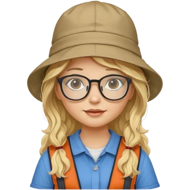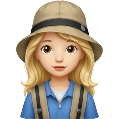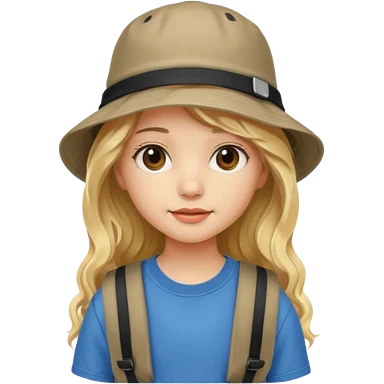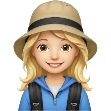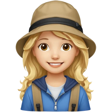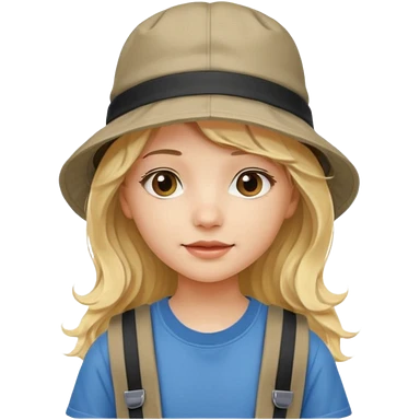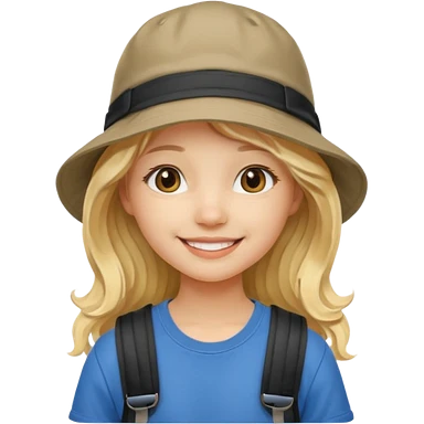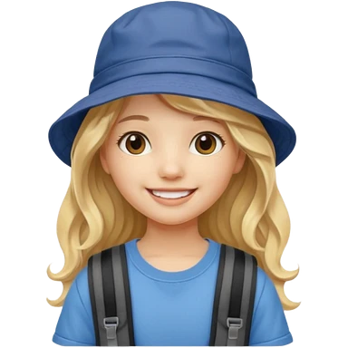 a young student girl with the backpack with bucket hat, blonde wavy long hair emoji