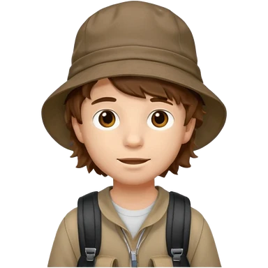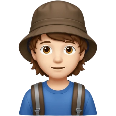 a young student boy with the backpack with bucket hat, brown wavy hair emoji