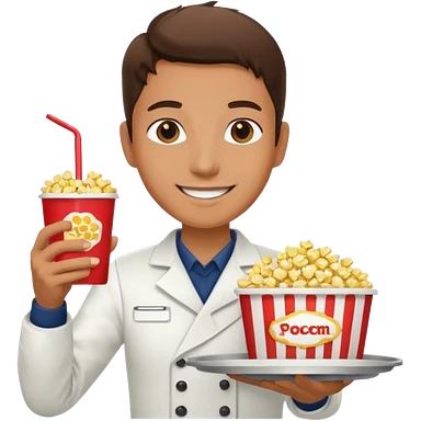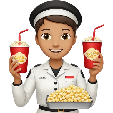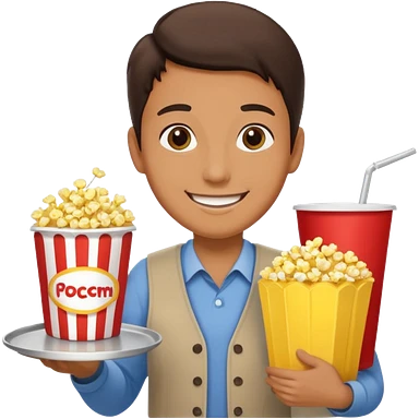 A smiling vendor carrying a tray of popcorn and drinks. emoji