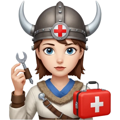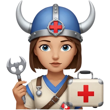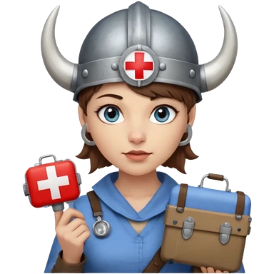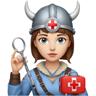 A young woman with beautiful blue eyes, short brown hair shaved on the sides, giving her a Viking look and a horned helmet. She holds a medical kit with a red cross icon in her hand. A stereoscope hangs around her neck. emoji