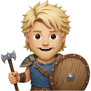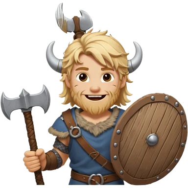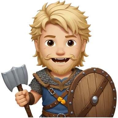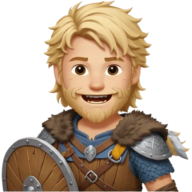 A young Viking warrior with messy blond hair, wooden shield, and fierce excited grin with horned helmet emoji