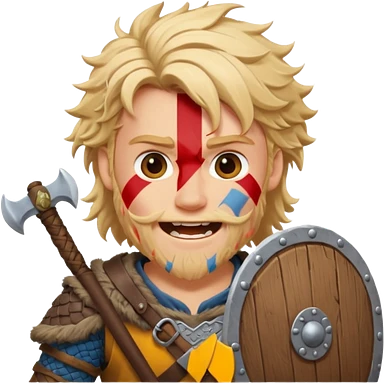 A young Viking warrior with messy hair painted cheeks, wooden shield, and fierce excited grin with horned helmet emoji | AI Emoji Generator