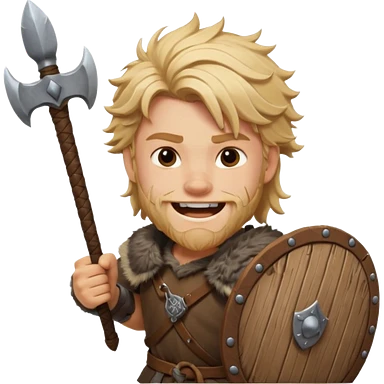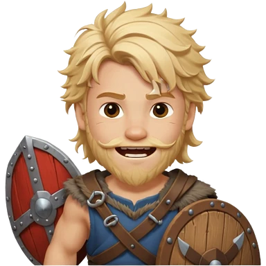 A young Viking warrior with messy blond hair, wooden shield, and fierce excited grin. emoji