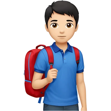 A young boy with casual and comfortable clothing, and one of his most well-known images shows him wearing a red polo shirt with blue and white details on the collar, along with a light-colored backpack on his shoulders. His hair is black. emoji