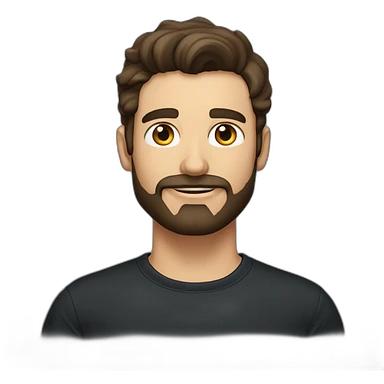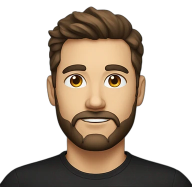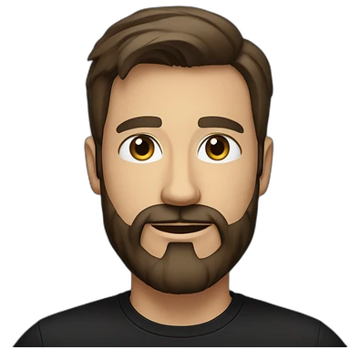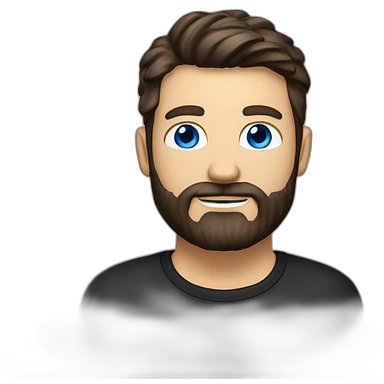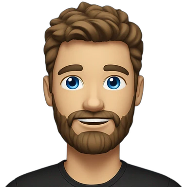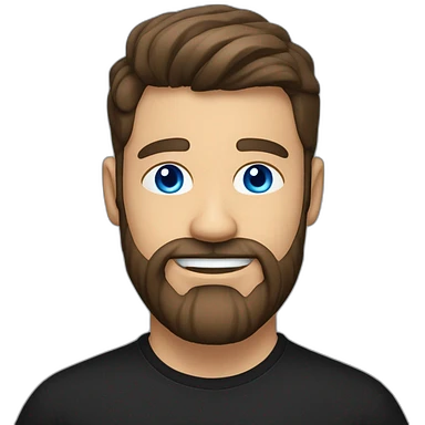 White man with blue eyes, dark brown hair, styled sideways backwards. He has a beard and mustache trimmed and wears a black t-shirt. emoji