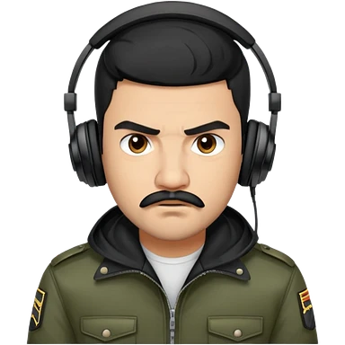 Cartoon avatar of a young latino man with very short black hair (military cut), trimmed beard only on the chin with mustache, wearing black jacket and headphones. Angry face. Semi-realistic, clean cartoon style, vivid colors, transparent background. emoji