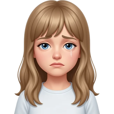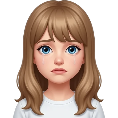 a young woman with long light brown hair and fringe and blue eyes is very sad emoji