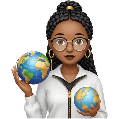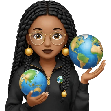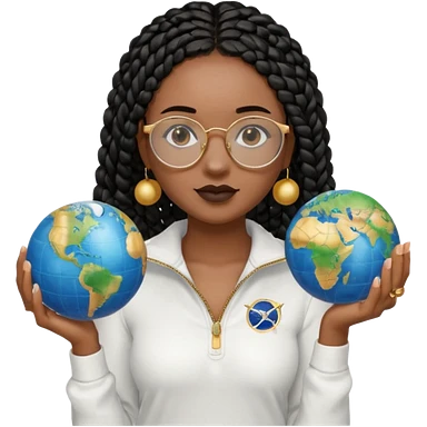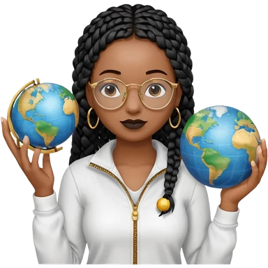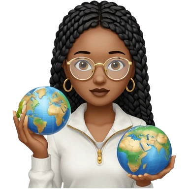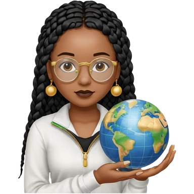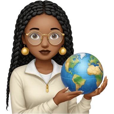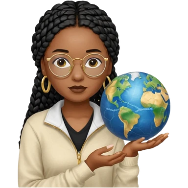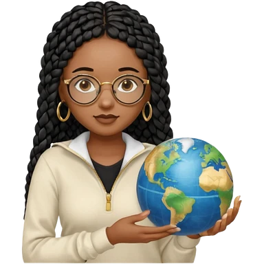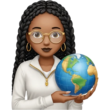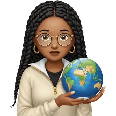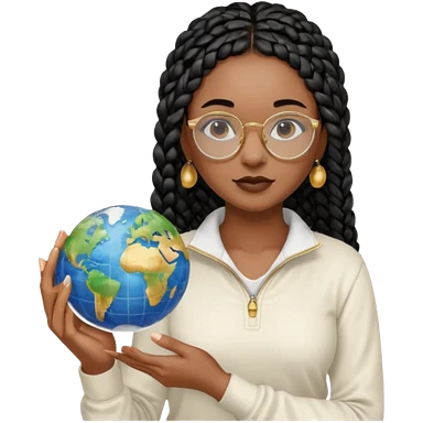 a-young-woman-wearing-fine-gold-round-glasses-and-black-hair-in-several-box-braids,-she-has-light-black-skin,-and-she's-wearing-a-white-shirt-with-an-blue-cardigan-on-top.-she's-holding-a-globe-in-one-hand.png emoji | AI Emoji Generator
