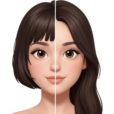 young pretty girl, face split in half, left side short hair, right side long hair, perfect eyebrows, long eyelashes, polished look, soft makeup, bright lighting emoji