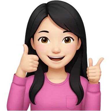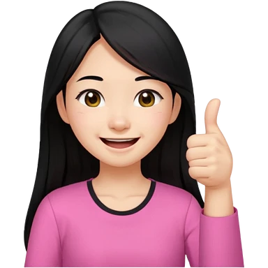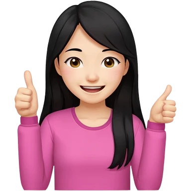 a girl genuinely feeling happy so so so much laughing so hard with her eyes folded long black hair asian girl on a pink shirt with her thumb up emoji