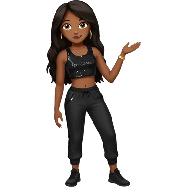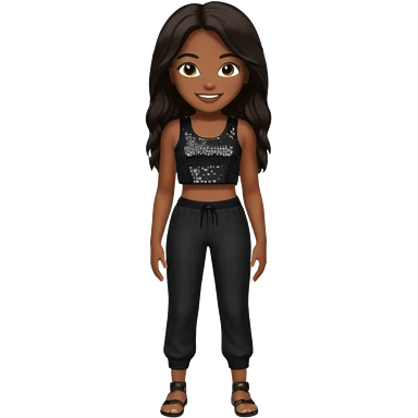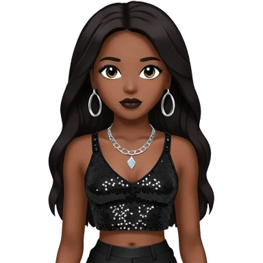 Aaliyah with black sequin crop top and pants, long dark brown hair emoji