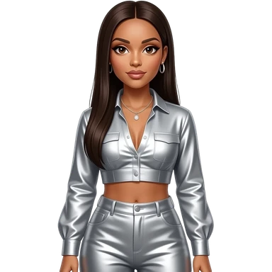 Aaliyah with dark brown eyes, long dark brown straight hair, silver metallic blouse crop top, silver metallic wide leg pants, necklace and earrings emoji