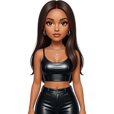 Aaliyah with dark brown eyes, long black straight hair with brown highlights, black metallic sleeveless sweetheart crop top, black metallic baggy pants, necklace and earrings emoji | AI Emoji Generator