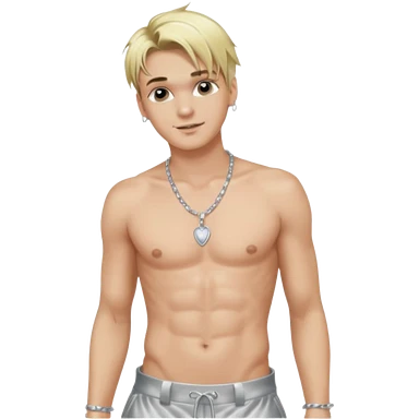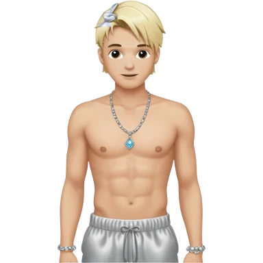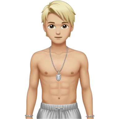 Aaron Carter with blonde hair, silver silk baggy pants, shirtless with necklace emoji