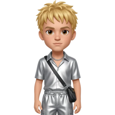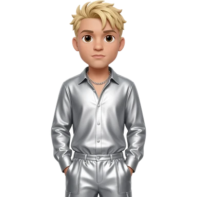 Aaron Carter with brown eyes, blonde hair, silver metallic shirt, silver metallic baggy pants, silver necklace emoji
