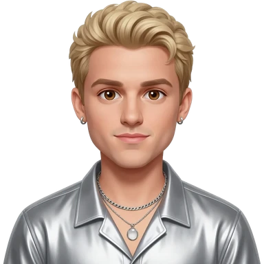 Aaron Carter with brown eyes, blonde hair, silver metallic shirt, silver necklace with short earrings emoji