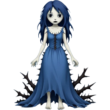 Gloomy ghostly fair lady with long ragged torn tattered dress, thorns across arms and legs, depressed face, ghoul-like gloomy dark greyish dull-colored deep-blue dark-black swampy monsterous lady woman (full body) emoji