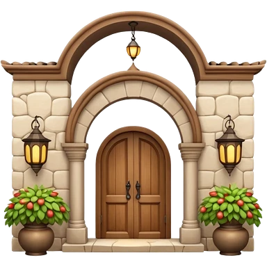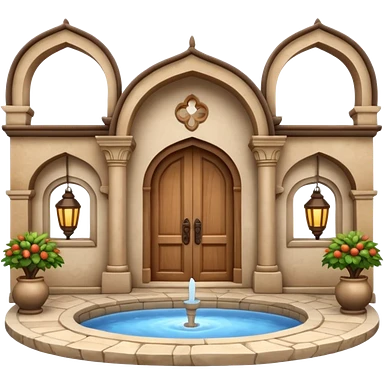 3D Apple-style emoji of a traditional Turkish han with courtyard, arches, fountain, wooden doors, and hanging lanterns. Rounded, glossy, smooth, soft shadows, white background. emoji